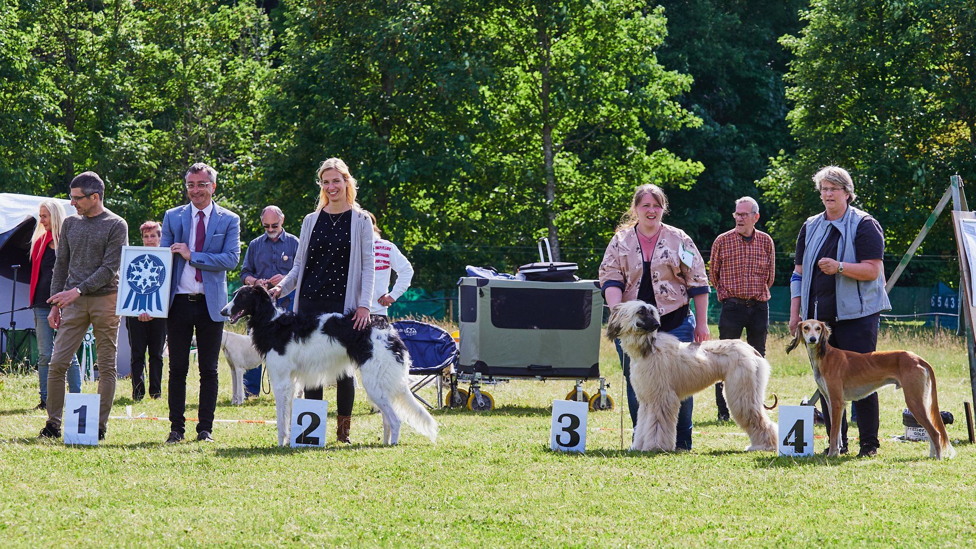 Am Samstag konkurrierten bei schönstem Wetter dann 116 gemeldete Hunde aus 11 Rassen um die verschiedenen CACs und VDH-Anwartschaften. Diesmal stellten die Whippets mit über einem Drittel aller gemeldeten Hunde die größte Gruppe der Teilnehmer dar. In den beiden Ringen ging das Richten vergnügt, souverän und trotzdem zügig vonstatten – die Hunde verteilten sich in etwa gleich auf die beiden Ringe, wo sie von Herrn Henne (D) und Herrn Kerpan (SL) gerichtet wurden. An dieser Stelle ein herzliches Dankeschön – wir hatten bei aller Ernsthaftigkeit sehr viel Spaß, besonders die lockeren Sprüche von Herrn Kerpan haben viel Heiterkeit ausgelöst – so sagte er zu einer Ausstellerin, die ihren Saluki nochmal „schön“ hinstellen wollte: Don't touch your Saluki - it's not your husband. Beide Richter haben einen super Job gemacht.